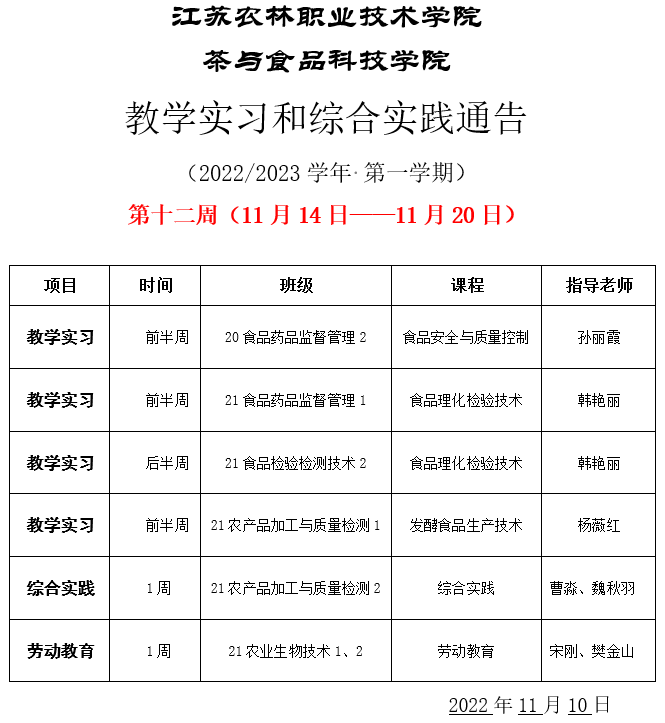 2022-2023-1学期第十二周教学实习与综合实践通告