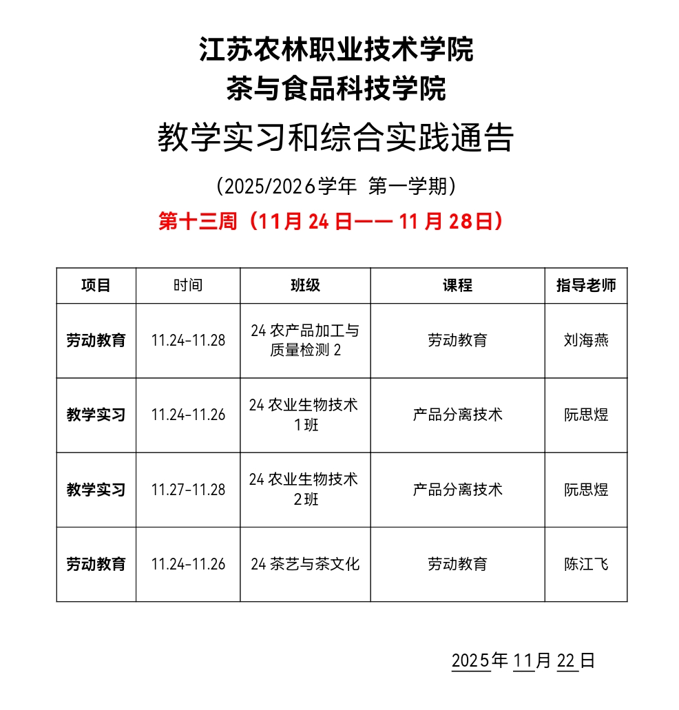 2025/2026学年第一学期第十三周教学实习和综合实践通告