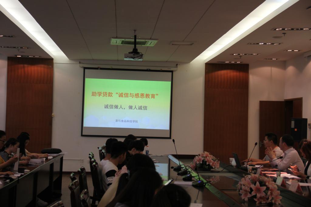 为了帮助贷款学生了解助学贷款还款细则,增强学生诚信还款意识,教育和引导大学生以实际行动做到诚信及时还款。茶与食品科技学院于5月2日下午在图书馆中层干部会议室举行助学贷款诚信还款教育活动暨宣誓仪式。茶与食品科技学院党总支副书记谢春芹、学校学工处学生管理科科长孙鑫、辅导员和助学贷款学生代表60余人参加了活动。