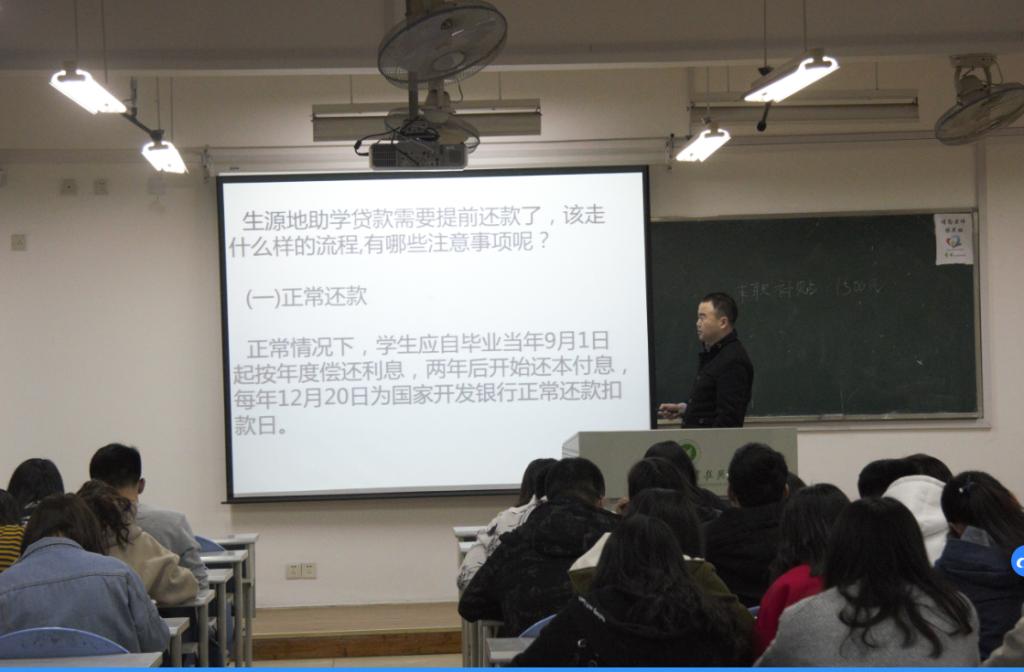 班会首先宣传助学贷款政策,结束了助学贷款办理流程及注意事项。同时从还款流程、还款方式、还款计算方法、提前还款、逾期还款影响等方面做了详细讲解。本次班会的成功举办对提高助学贷款成功率、增强学生诚信意识,降低助学贷款违约率等方面起了重要的作用。同时让更多同学了解国家学生资助政策,使国家的各项资助政策深入人心,更多学生在资助政策的照耀和帮助下,得到实惠、深受教育,顺利成长成才。