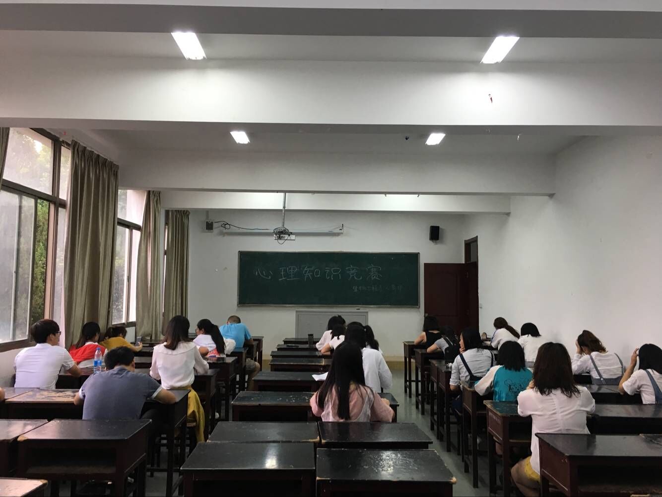 本次初赛以闭卷笔试进行,考题主要由基础题和综合题目两部分组成。其中,综合题目中的案例分析题密切结合大学生在学校生活中可能遇到的问题和情景,着重考察了学生对心理知识的掌握和自我心理的调控支配能力。笔试现场紧张而秩序井然,同学们沉着应对、冷静答题。
