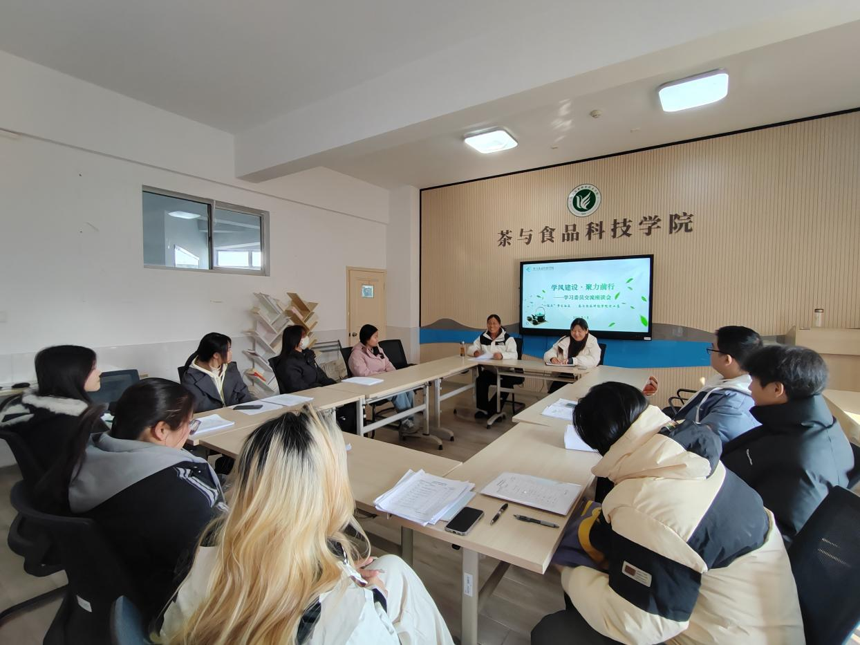 为强化学风建设,发挥学生骨干桥梁作用,2026年1月9日,茶与食品科技学院一站式学生社区联合学院关工委在综合楼317举行“学风建设,聚力前行”学习委员交流会。会议由学院党总支副书记嵇怡主持,学院关工委常务副主任唐迪老师作主题发言,各班级学习委员参加。