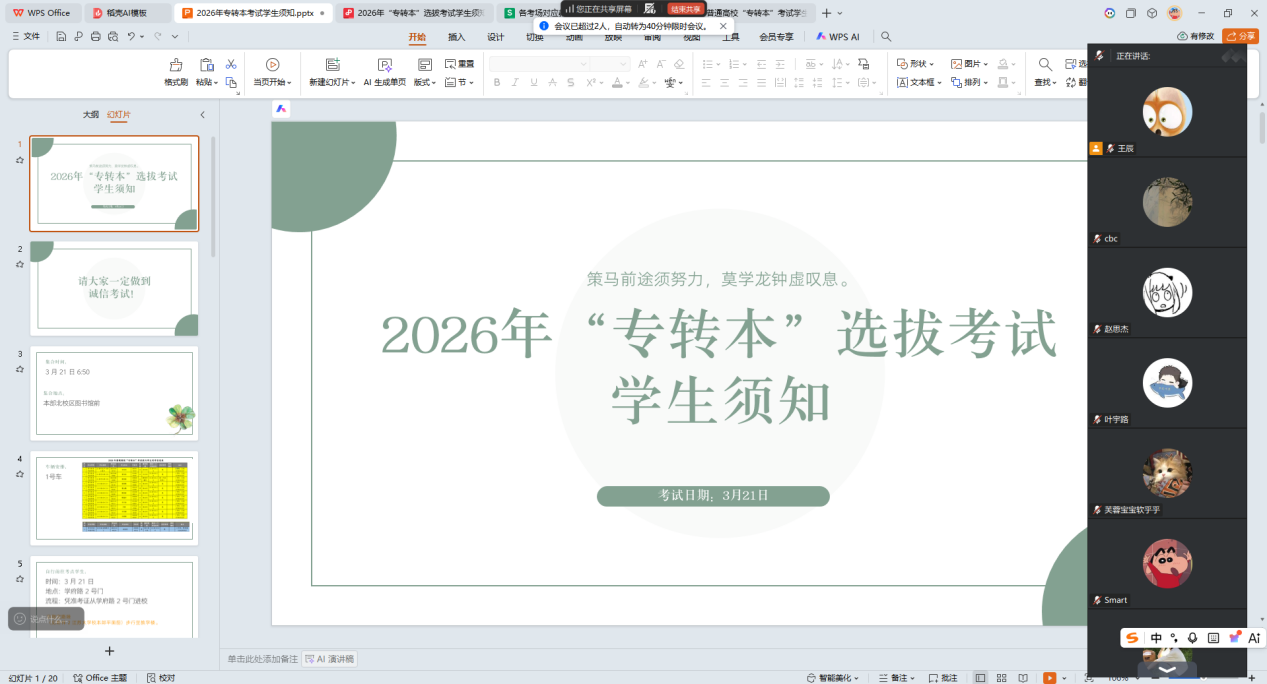 为保障2026年江苏省普通高校“专转本”选拔考试平稳顺利进行,切实帮助考生明晰考务要求、提振备考信心,3月11日晚19:00,茶与食品科技学院召开专转本考试考前动员大会。学院辅导员王辰主持会议,全体专转本备考考生参会。