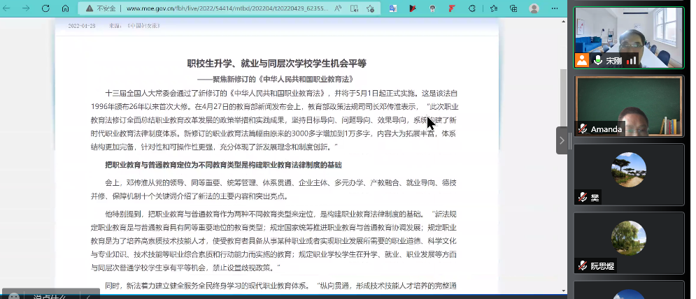 随后,支部宣传委员代升飞老师带领大家一起学习了2022年4月20日第十三届全国人民代表大会常务委员会第三十四次会议修订的《中华人民共和国职业教育法》(以下简称《职业教育法》)。《职业教育法》最大的特点在于强调职校生升学、就业与同层次学校学生机会平等,打破止步于专科层次的“天花板”,打通职业教育人才成长“立交桥”,强调职业培训与职业学校教育并重。