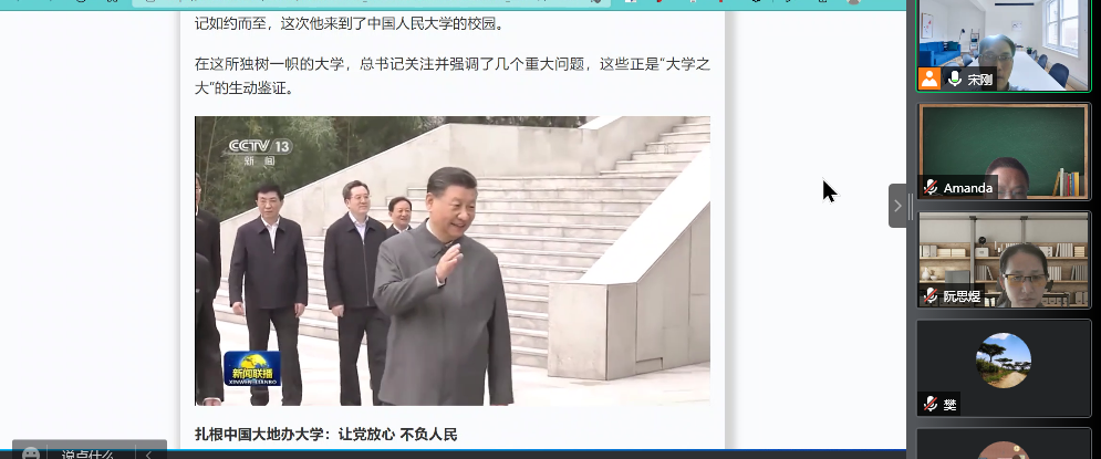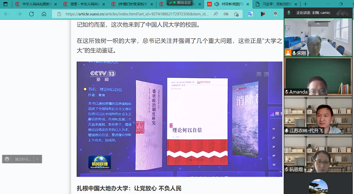 为深入贯彻落实习近平总书记在中国人民大学考察时重要讲话精神,茶与食品科技学院教工第二党支部于5月19日组织了“三会一课”在线集体学习。学习中,全体党员观看了习近平总书记在中国人民大学考察的央视新闻报道,在支部书记宋刚老师带领下,深入学习习近平总书记对高校和大学生关注和强调的几个重大问题。一是高校要扎根中国大地办大学,让党放心,不负人民;二是思政课的本质是讲道理;三是要回答时代之题,彰显中国之理;四是高校教师要做“经师”和“人师”相统一;最后要勇当开路先锋、争当事业闯将。