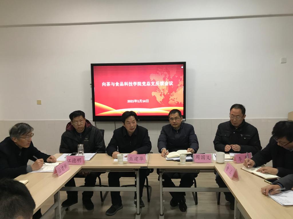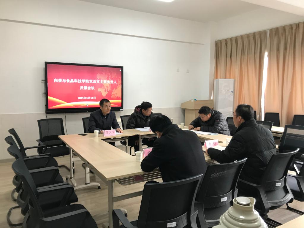 根据学院党委巡察工作领导小组的安排,2021年1月14日,党委第二巡察组向茶与食品科技学院党总支反馈巡察情况。巡察组组长江德明代表巡察组向茶与食品科技学院党总支领导班子进行了反馈,党委委员、纪委书记周国义同志代表巡察工作领导小组讲话提出整改要求,茶与食品科技学院党总支书记李静同志主持会议并作表态发言。学院党委书记巫建华同志到会指导并发言。