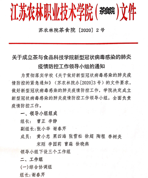 为积极响应学校疫情防控集结号,茶食院党政领导高度重视,迅速成立了二级学院疫情防控工作领导小组,并设立综合协调组、教师工作组、学生工作组三个小组,对疫情工作进行了详细的部署动员。