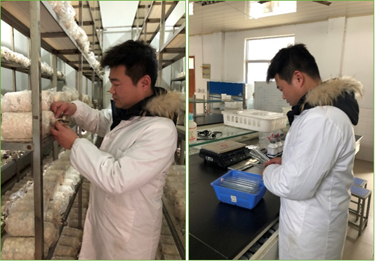 食用菌基地生产工作离不开人员值守。新冠病毒疫情发生以后,我院党员教师戴照琪同志仍坚守岗位,不顾个人风险,保障了基地食用菌的正常生产。