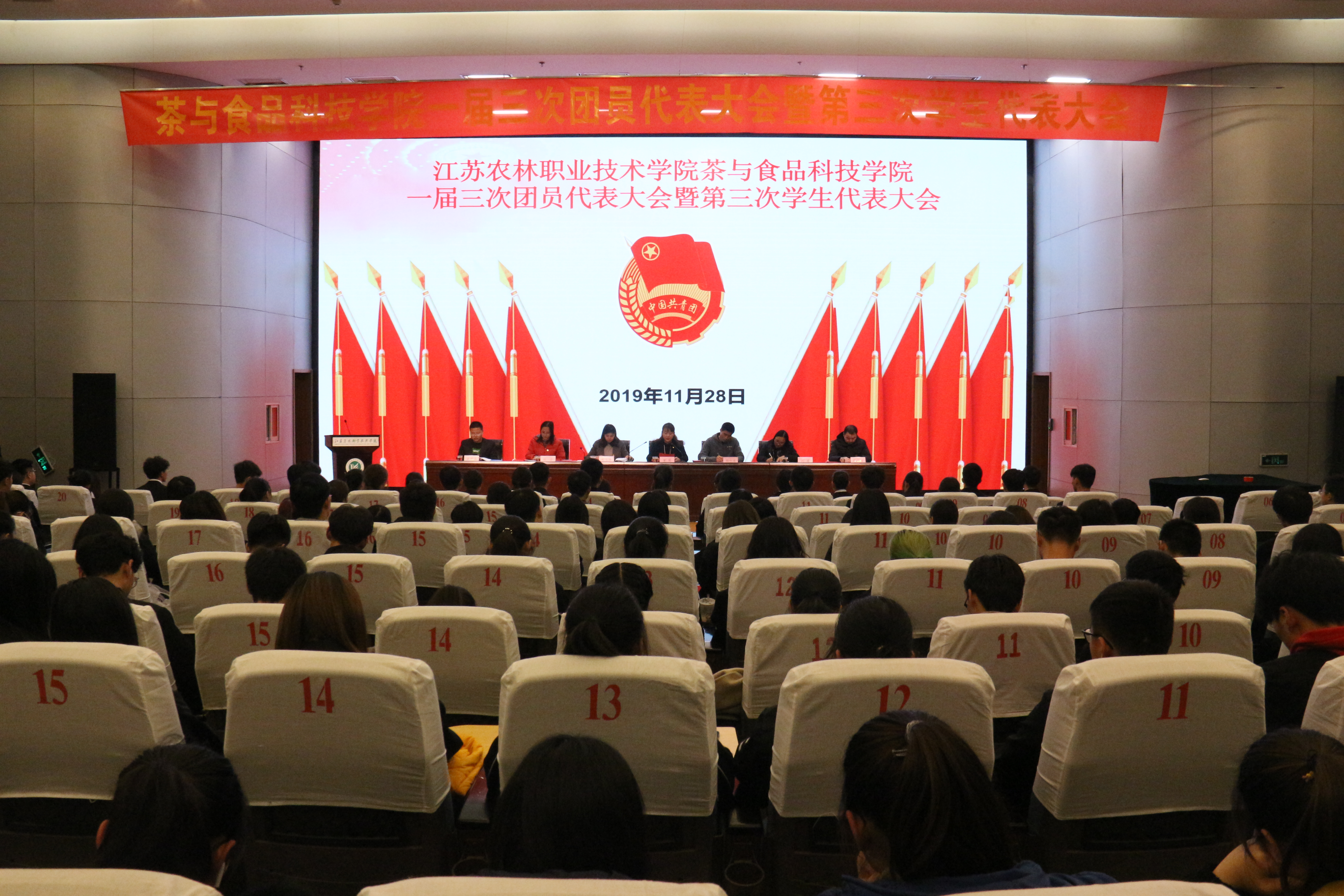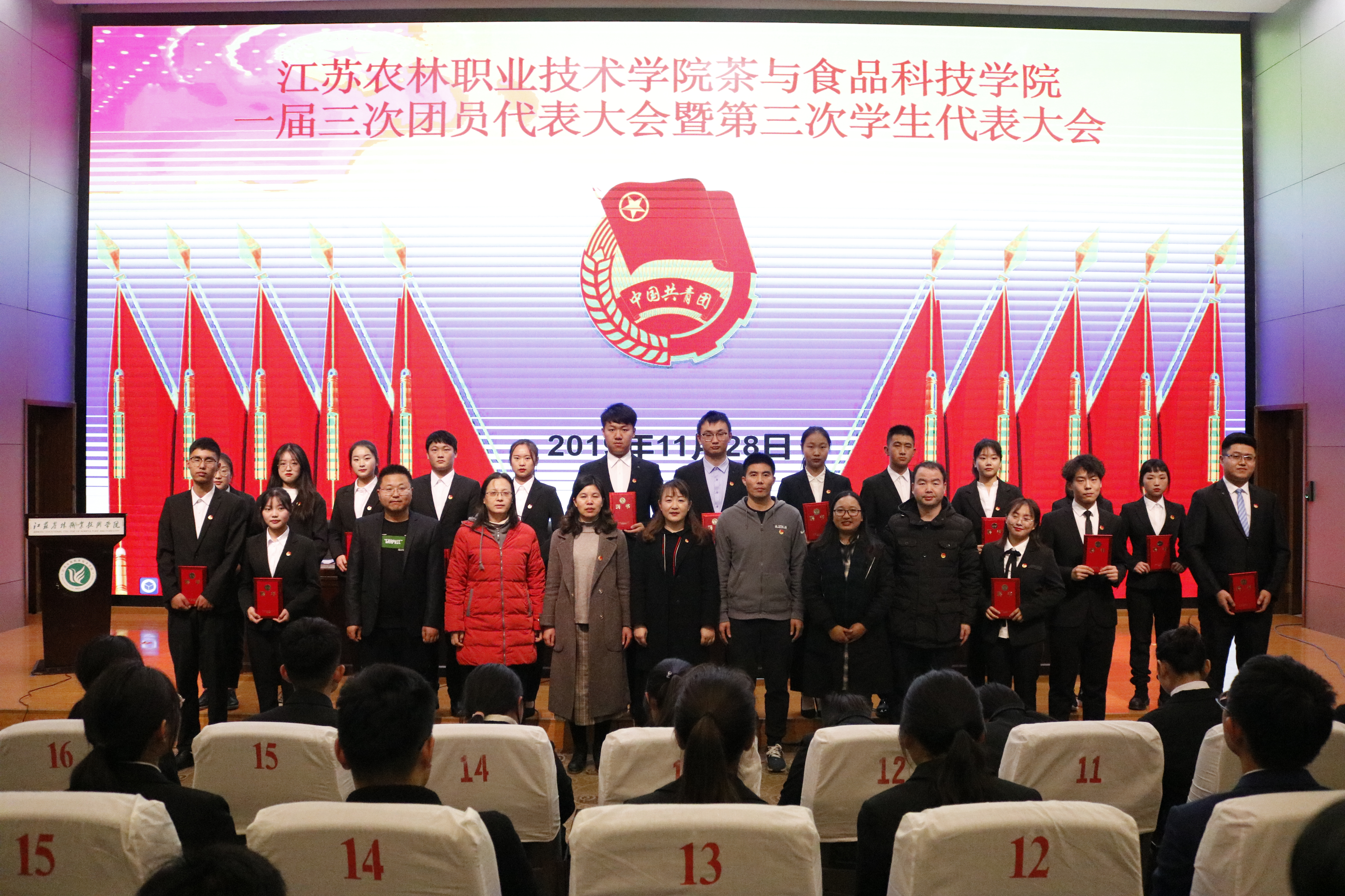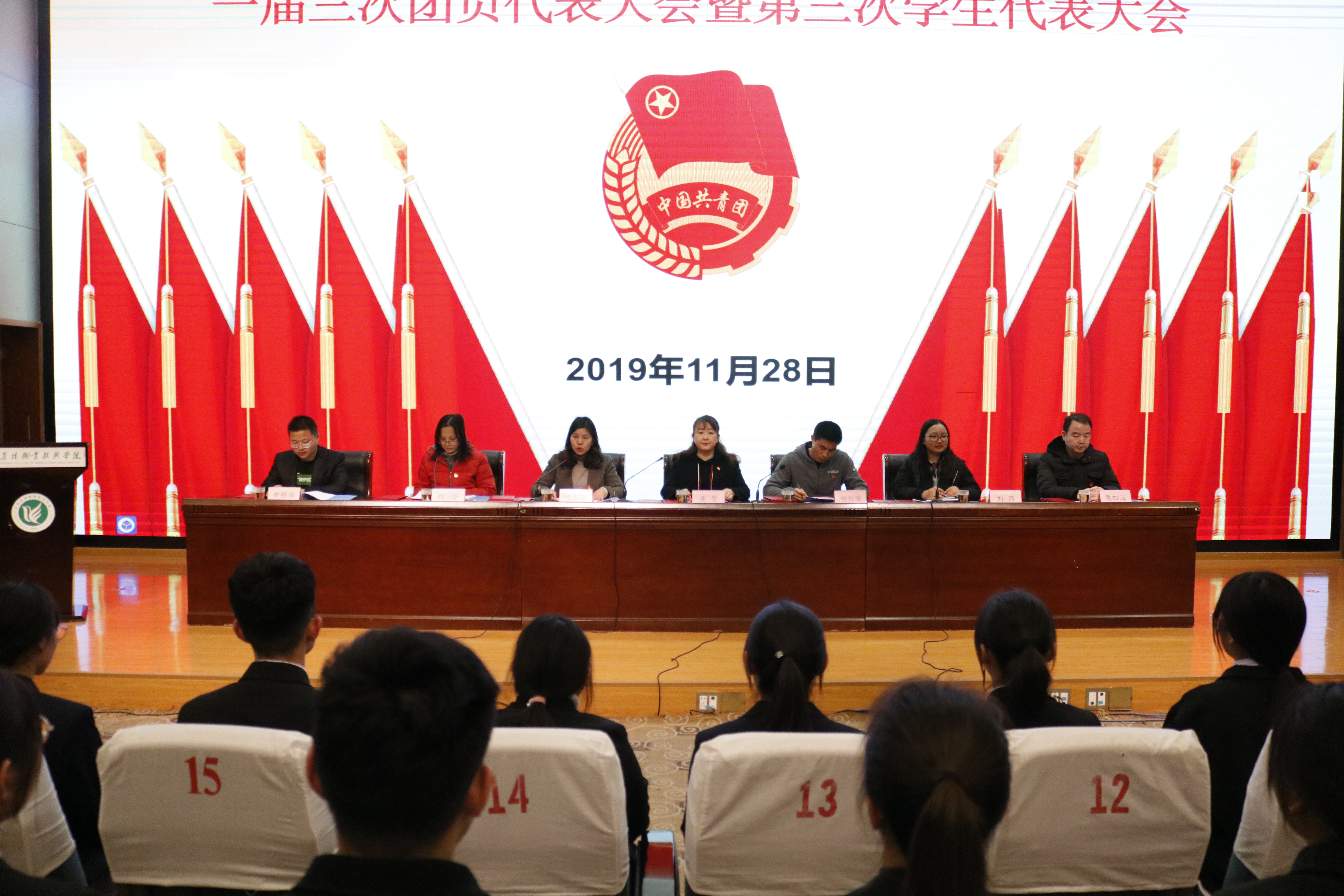 11月28日,在庄严的国歌声中,我院一届三次团员代表大会暨第三次学生代表大会在图书馆报告厅隆重召开。学校团委书记董慧老师、学工处副处长杨红进老师、学院党总支副书记谢春芹老师、学工办相关老师以及123名团员青年、学生代表以及候选人出席了本次大会,会议由分团委书记刘丽主持。