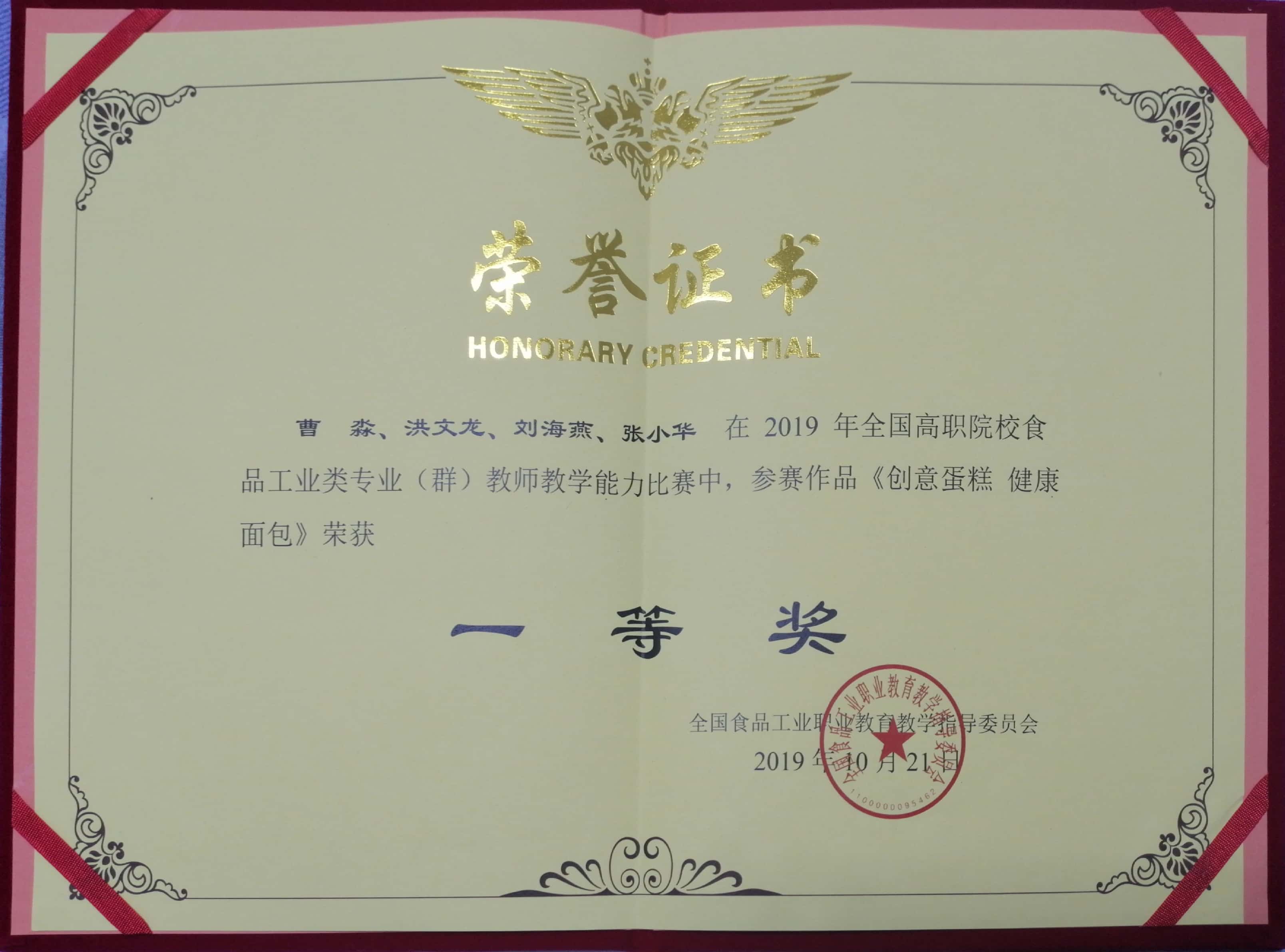 10月21日,我院曹淼、洪文龙、刘海燕、张小华教师团队在2019年全国高职院校食品工业类专业(群)教师教学能力比赛中荣获一等奖。