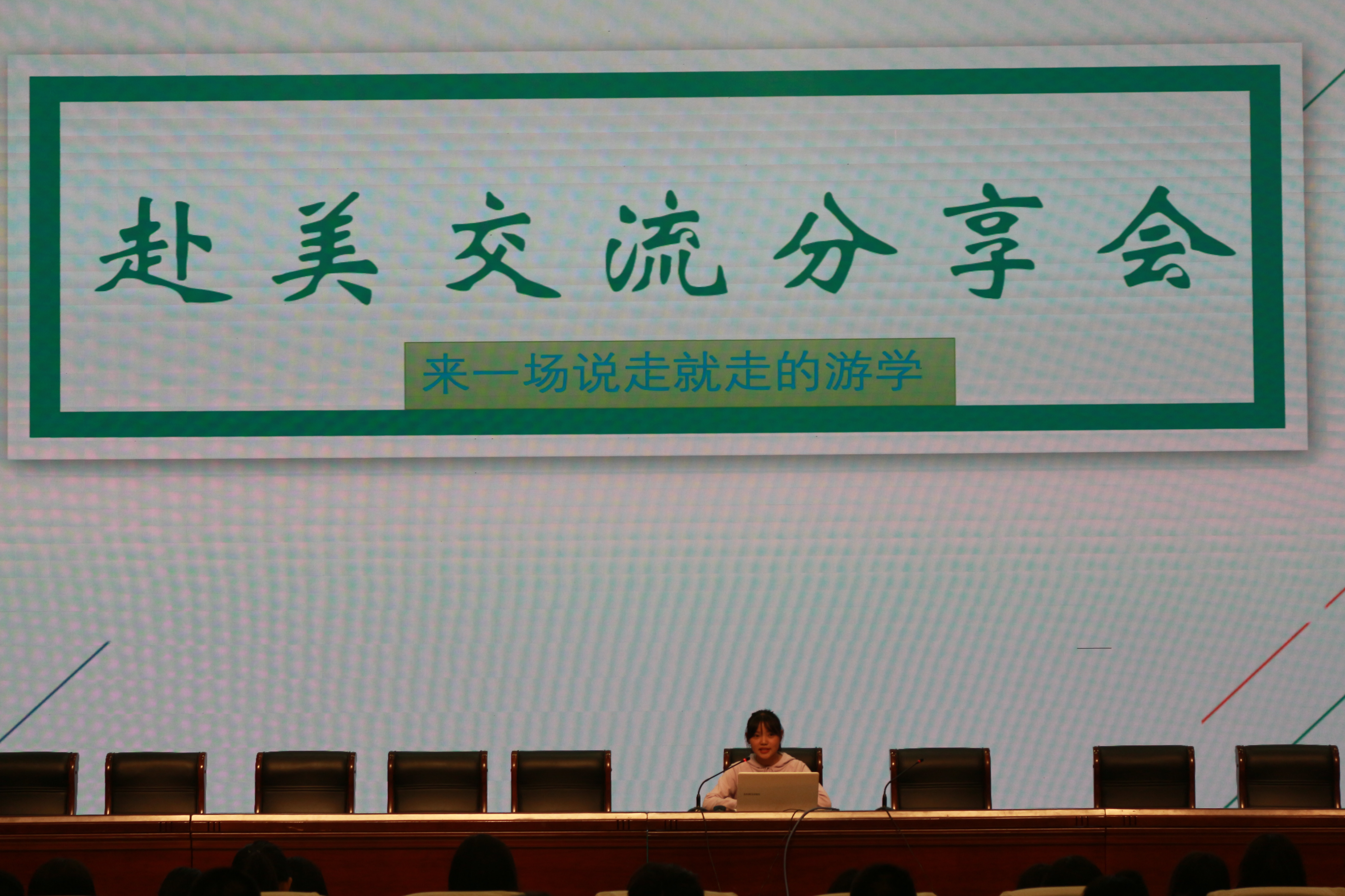 交流会上,俞蓉蓉同学通过图文、视频的方式介绍了暑假赴美游学的所见、所闻、所感,并鼓励大家早立目标、勤奋学习、勤于实践,不断丰富自己的大学生活、提升自己的综合实力。