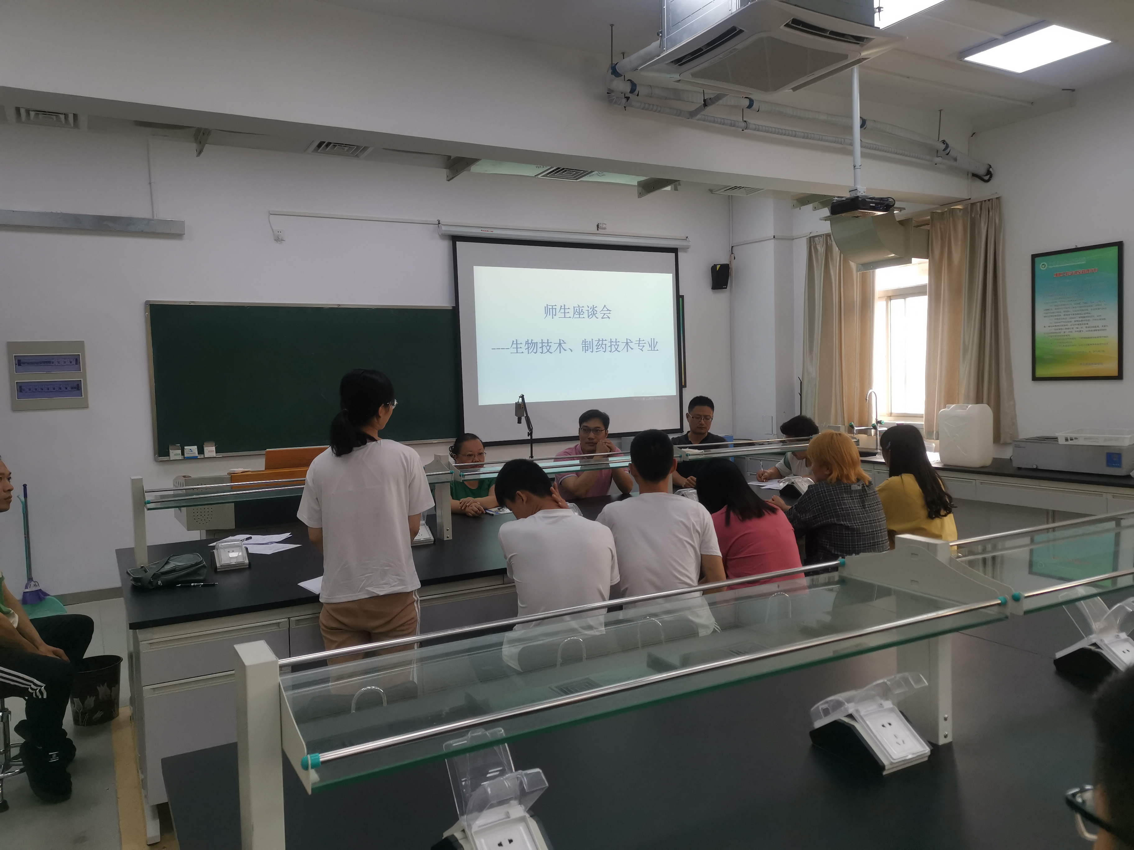 生物技术与制药技术教研室在实验楼S-A304、食品加工教研室在S-A101、食品检测教研室在J1-B109召开座谈,会上同学们对教学实习内容的安排、学习中的困难、今后的就业方向、学生活动的有效性等方面提出了疑问,现场的教师给予解答,并强调技能训练、自主学习的重要性。