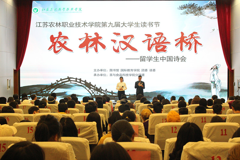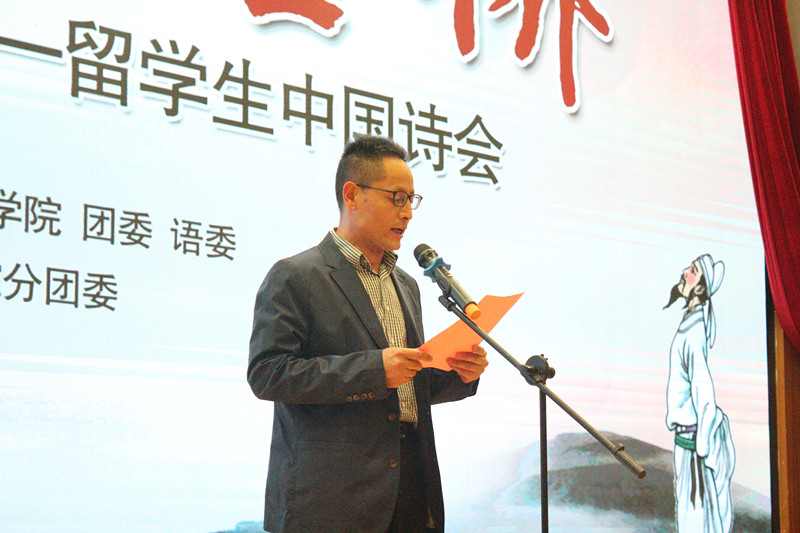 为弘扬中华诗词魅力,培养留学生学习汉语的兴趣,提高留学生汉语运用能力,4月26日,第九届大学生读书节系列活动之“诵古今经典 享诗词之美”汉语桥留学生诗词会在图书馆报告厅成功举办。此次活动由图书馆、国际教育学院、校团委、校语委主办,我院分团委承办,来自国际教育学院的12名留学生参加了本次诵读大赛,图书馆张田林馆长致辞。