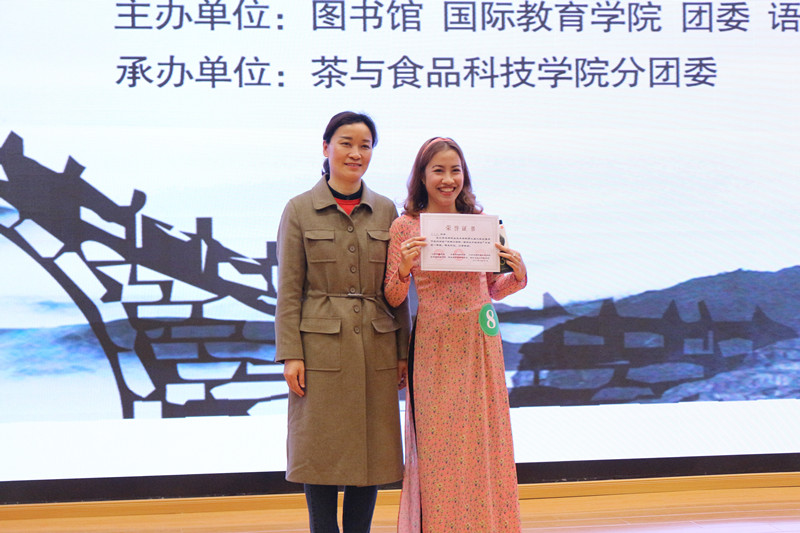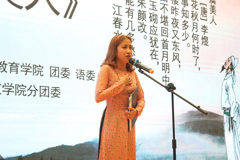 比赛中,外国留学生用流利的中文依次朗诵经典古诗词,精妙绝伦的《望岳》、词句优美的《虞美人》、凄清婉转的《声声慢》等都彰显了中华诗词的魅力。期间穿插的诗词接龙和书法表演更是活跃了现场的氛围。最终,来自越南的范氏阳同学诵读的《虞美人》勇夺冠军,国际教育学院郭海红院长为其颁奖。