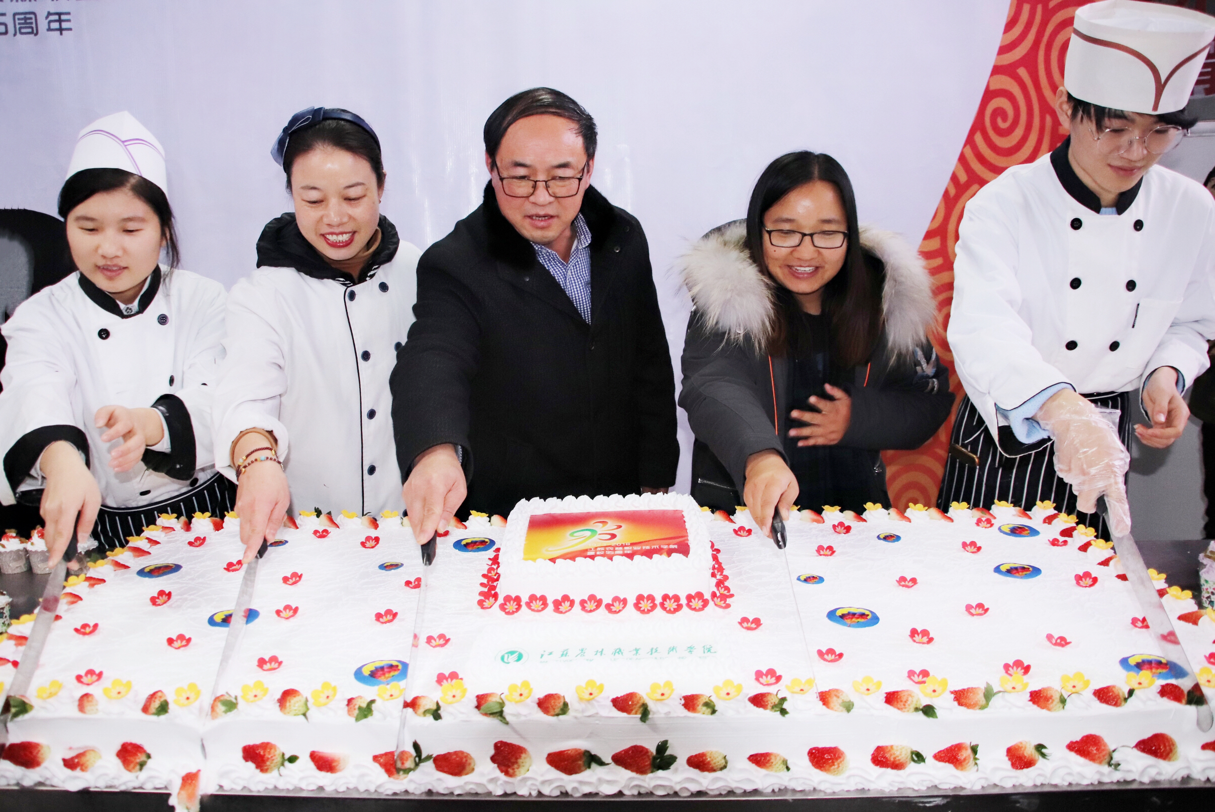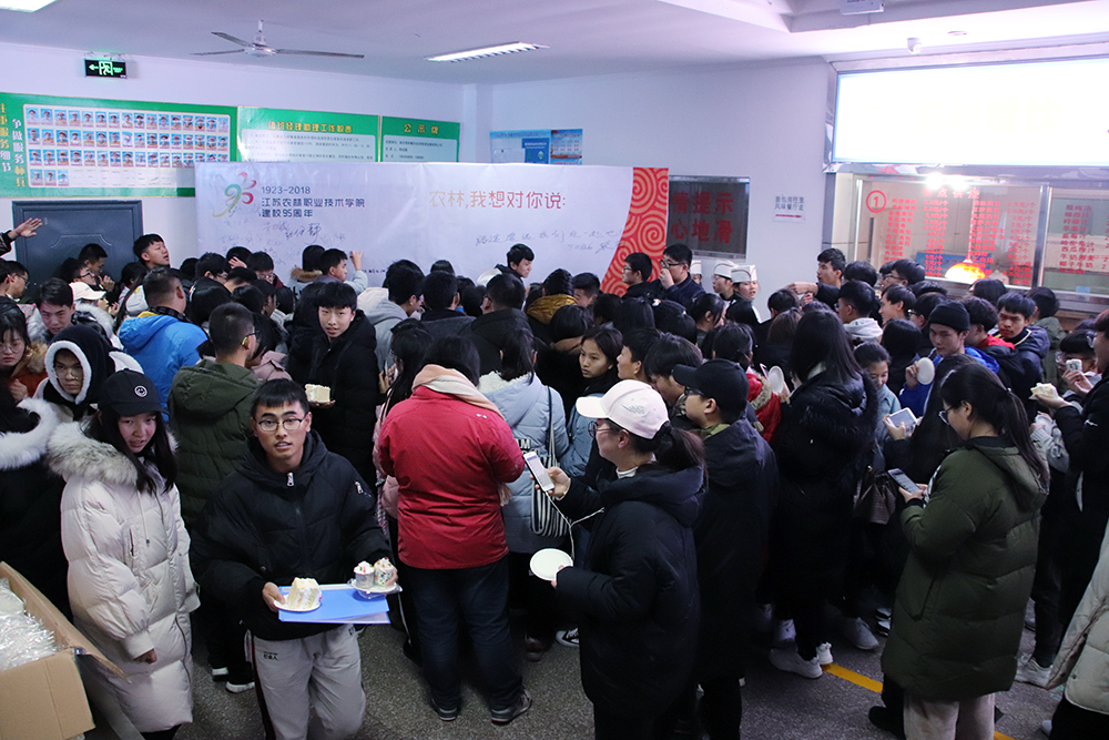 活动中,由食堂面点师傅制作的校庆生日蛋糕长1.6米,点缀着学院的标志性元素和95周年校庆图案,同时我院烘培社团也用自己制作的小蛋糕拼写成“JSAFC95”字样祝贺学院95周年校庆。在品尝了校庆生日蛋糕后,师生们纷纷在签名墙上郑重写下多农林的祝福,表达了他们的美好祝愿。