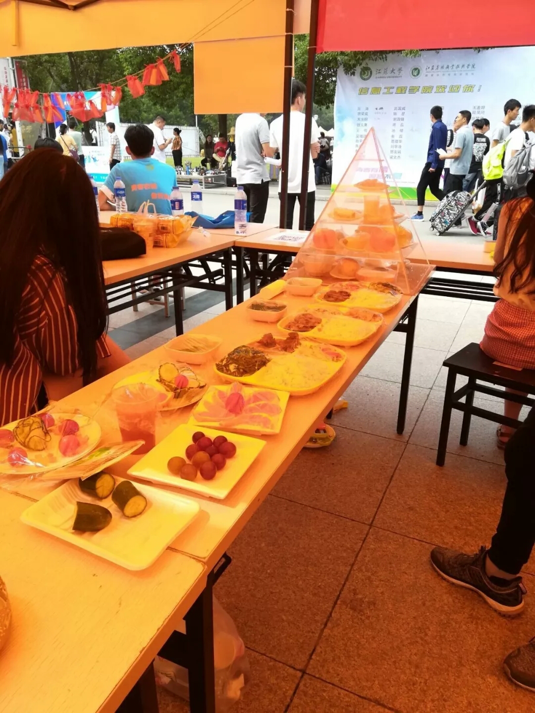活动现场,人头攒动。来自发酵社团、百果香酒庄、果蔬创意社团、营养协会、烘焙社团、嘉木茶艺社团6个社团的同学们热情洋溢,分别展示了啤酒、葡萄酒、水果蔬菜拼盘、膳食宝塔模型、西点和茶艺,吸引广大2018级新生和家长驻足品尝。