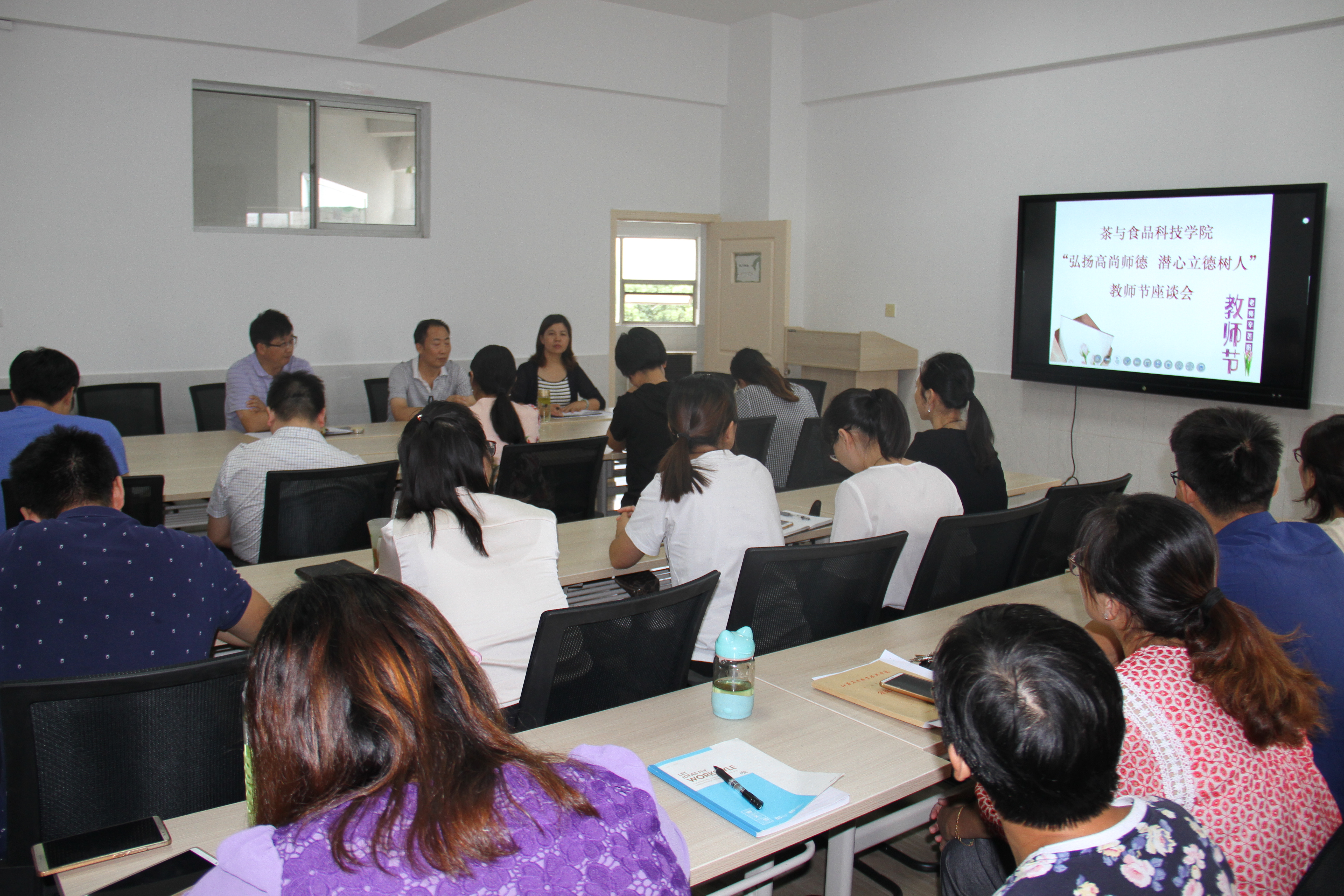 在第34个教师节来临之际,9月10日下午,我院以“弘扬高尚师德,潜心立德树人”为主题,在综合楼西301会议室召开教师节座谈会。全院教师欢聚一堂,曹正院长主持会议。