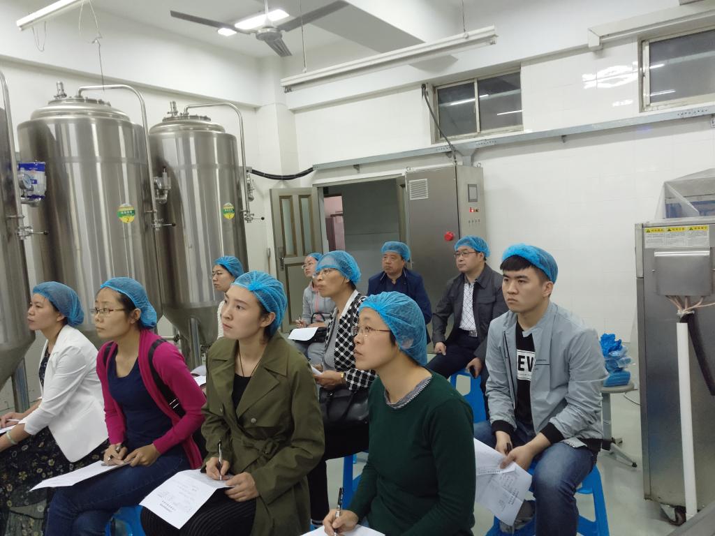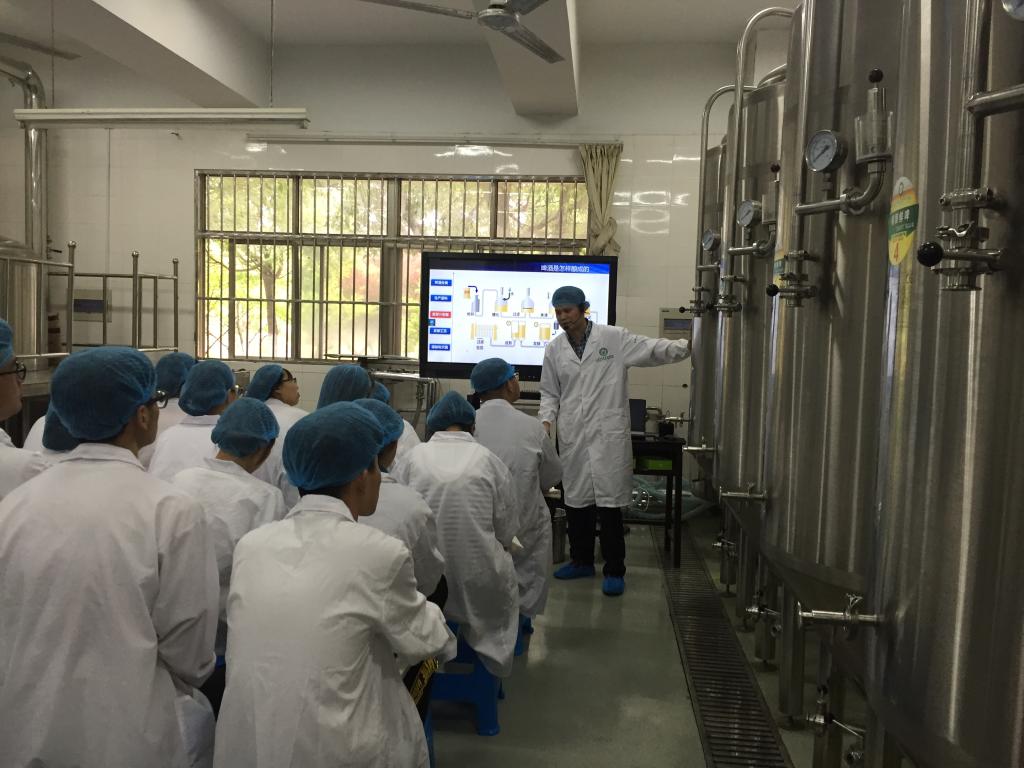 食品加工技术班的学生认真讲解“啤酒是怎样酿成的”;下图:听课老师全神贯注地观摩学习。