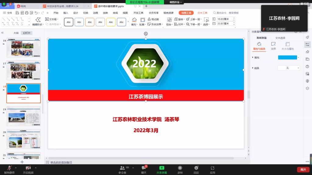 3月24日下午,由中法农业培训和乡村振兴服务中心、法国农业与食品部中法农业教务处主办,江苏农林职业技术学院承办的“中法茶产业主题线上交流研讨会”成功举办。茶与食品科技学院师生参加了此次线上交流活动,我院李园莉、汤茶琴两位老师就涉茶专业培训开展与培训基地建设情况向参会人员做了介绍。法国艾内邦农业学校农场主任阿诺·比隆、茶叶事务负责人马丽·肖塔、欧洲茶叶协会主席卢卡斯·本·莫拉分别介绍了茶叶在法国发展的前景、法国中式茶园规划设计比赛情况、协会茶叶种植情况和法国茶叶种植现状,苏州农业职业技术学院、杨凌职业技术学院代表也在活动中作了交流。