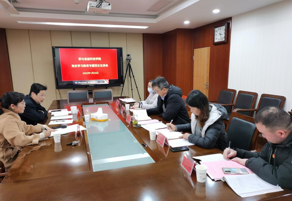 1月24日下午,根据学校《中共江苏农林职业技术学院委员会关于开好中层党员领导干部党史学习教育专题民主生活会的通知》(苏农林院委〔2022〕2号)文件要求,茶与食品科技学院党总支在综合楼8楼会议室召开中层党员领导干部党史学习教育专题民主生活会。党总支副书记、院长曹正,副书记谢春芹以及总支委员出席了会议,副院长张小华列席会议。学校党委书记巫建华同志出席并指导,组织人事处副处长李丽陪同出席会议。