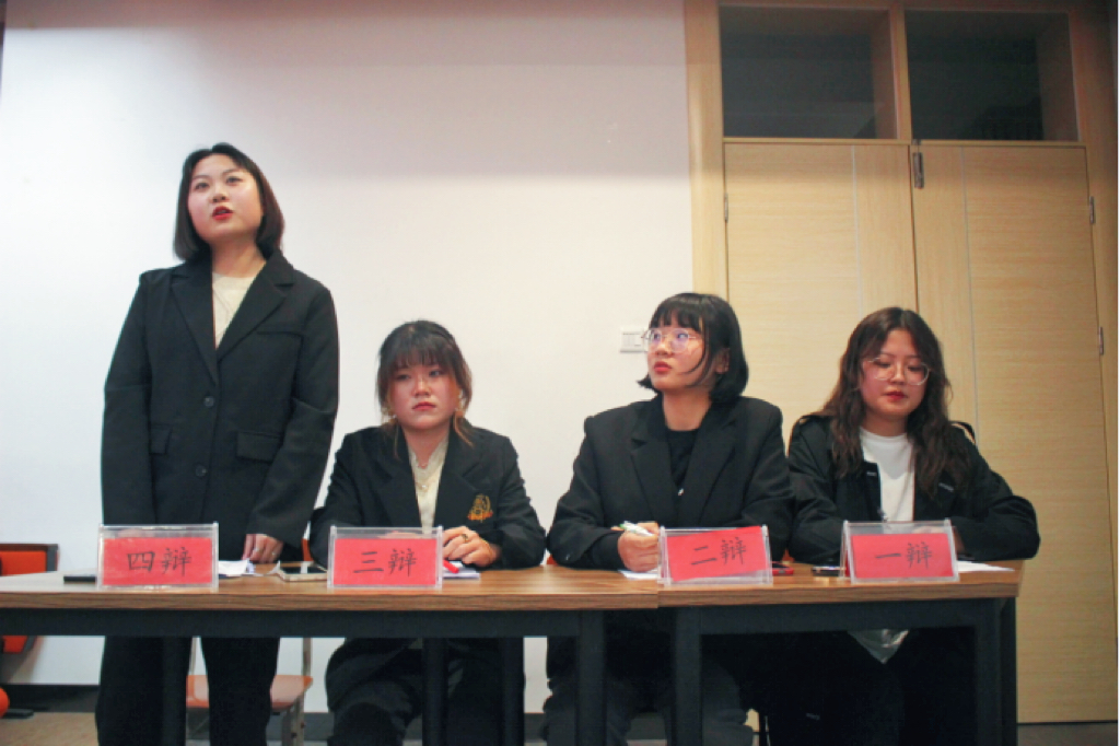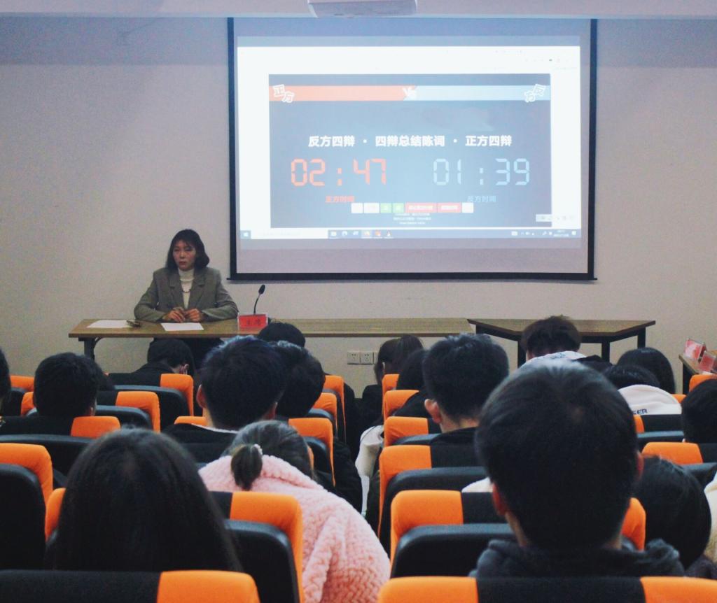 在辩论赛上正反双方先后围绕”在司法审判中,参考判例在我国利大于弊还是弊大于利”以及“社会良好秩序的形成主要靠道德还是法律”两个辩题进行了辩论。辩手们唇枪舌战,口若悬河。常常是妙语连珠,侃侃而谈又不失风度。在自由辩论阶段更是金句频出;最终“在司法审判中,参考判例在我国利大于弊”及“社会良好秩序的形成主要靠法律”两个观点获胜。