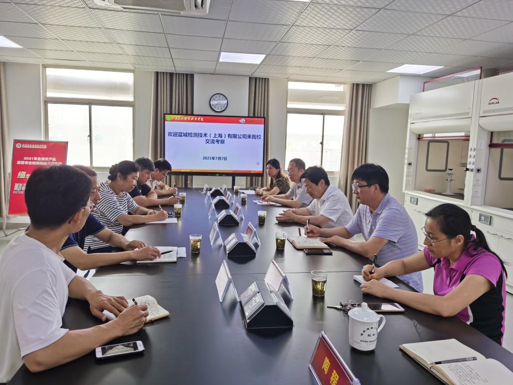 7月7日下午,蓝城检测技术(上海)有限公司总裁助理孙晓陆、质量总监章舒褀一行来我院江苏农林检测中心考察交流,江苏省农产品质量检验测试中心副主任潘康标、学院党委书记巫建华、茶与食品科技学院负责人参与交流会议。