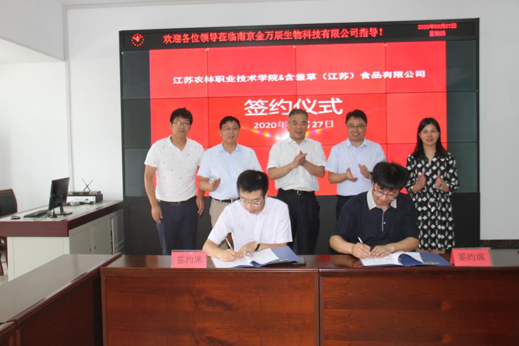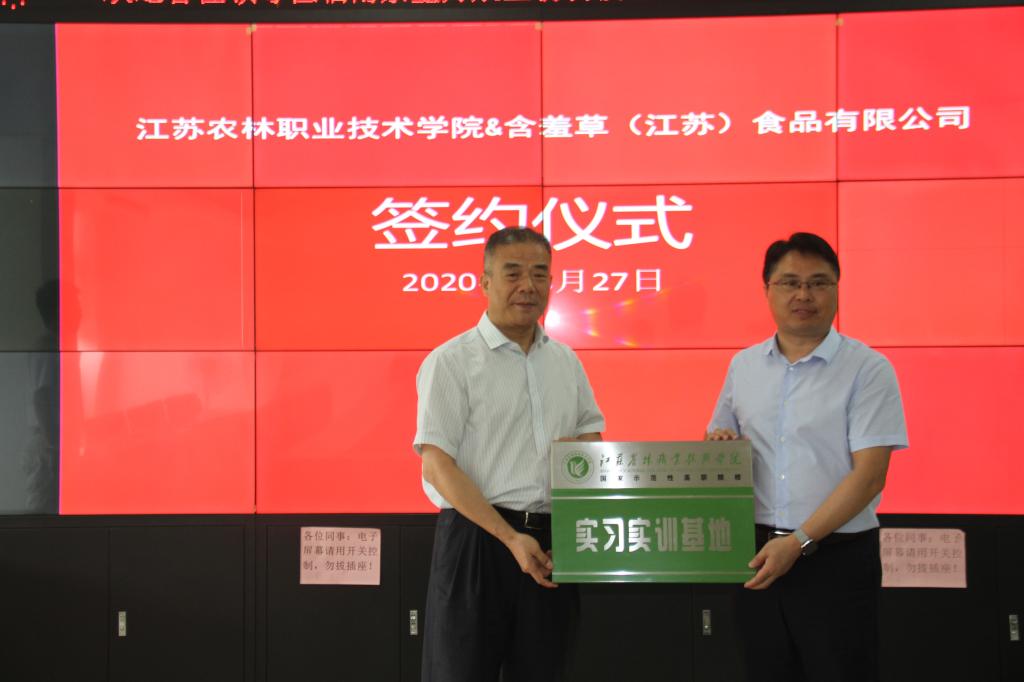 双方交流后学院简祖平院长与含羞草(江苏)食品有限公王健坤进行共建校外实习基地授牌仪式,茶与食品科技学院院长曹正代表茶食院与含羞草(江苏)食品有限公司签订了校企合作协议。