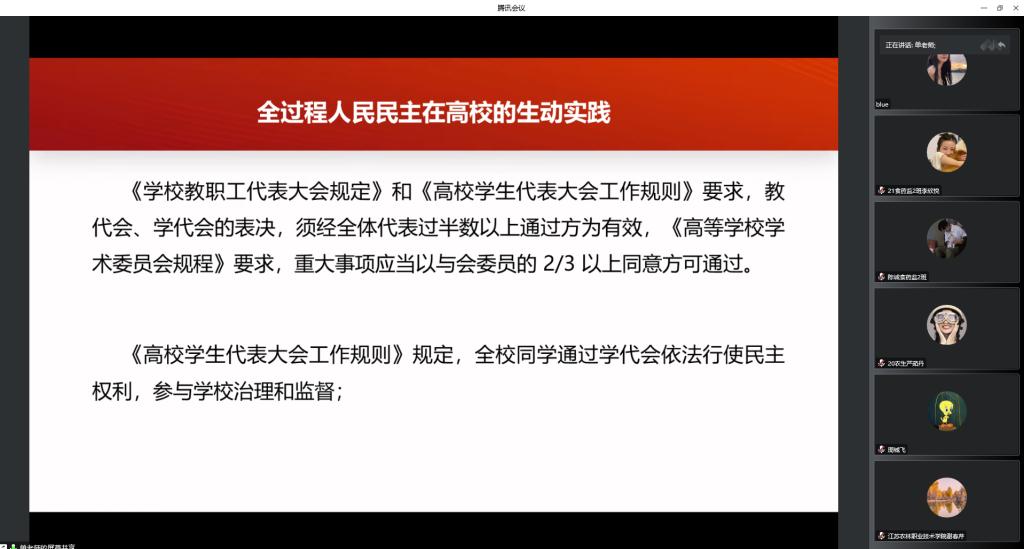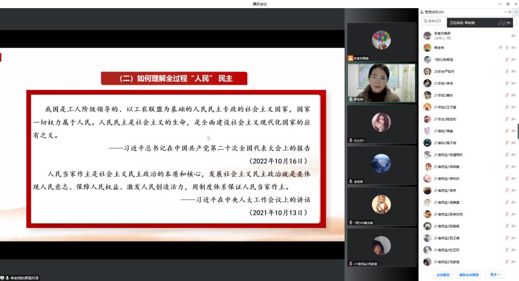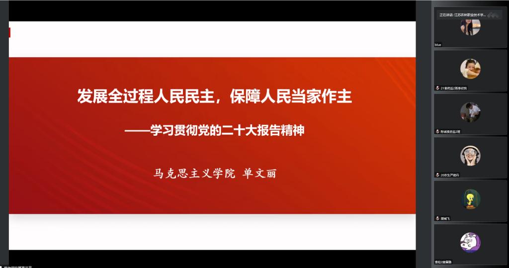 12月14日下午,我院党总支认真学习贯彻党的二十大精神,特邀马克思主义学院党总支教工第一支部单文丽老师,通过线上会议的形式开展了一场题为“发展全过程人民民主,保障人民当家作主”的专题讲座。