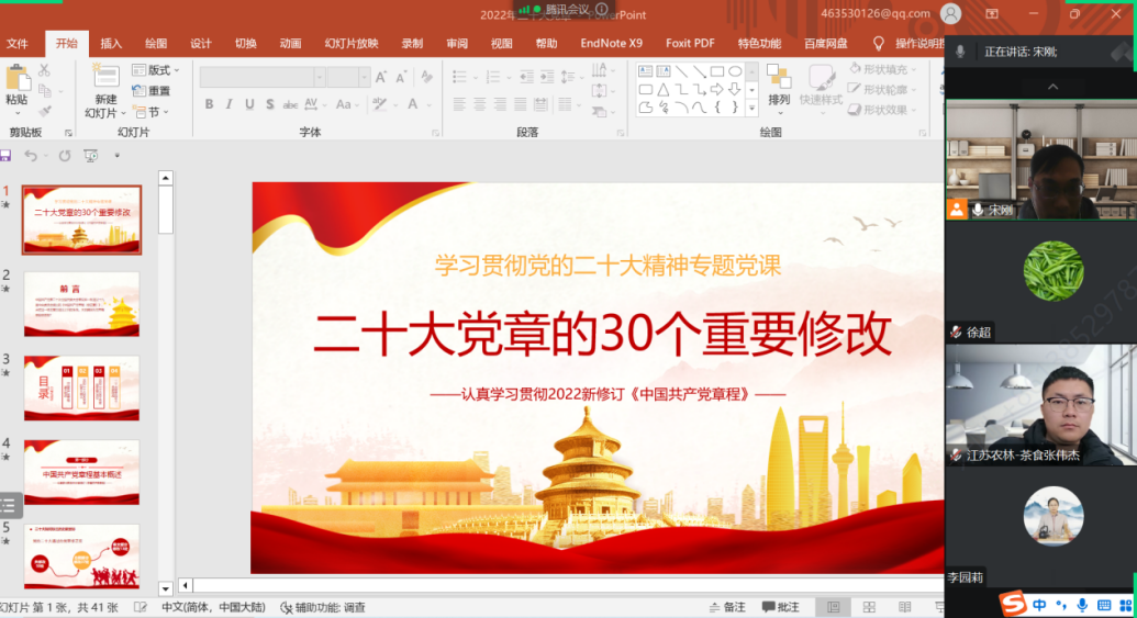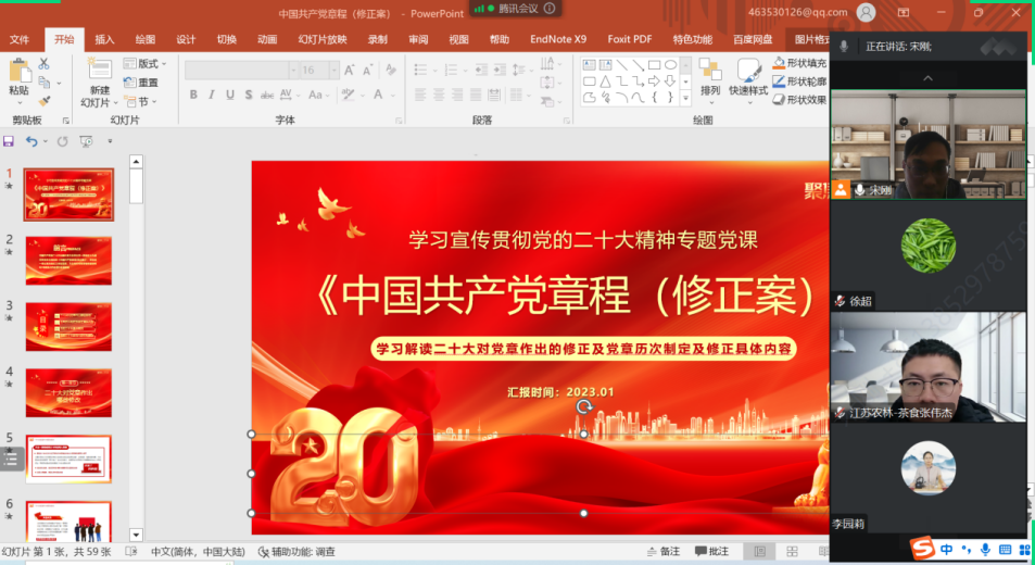 为深入学习贯彻党的二十大精神,不断凝聚思想政治共识,1月5日,茶与食品科技学院教工第二党支部开展党的二十大精神专题宣讲会,宋刚书记带领大家认真研学新修订的中国共产党章程,党支部全体成员认真聆听,汲取力量,奋进新征程。