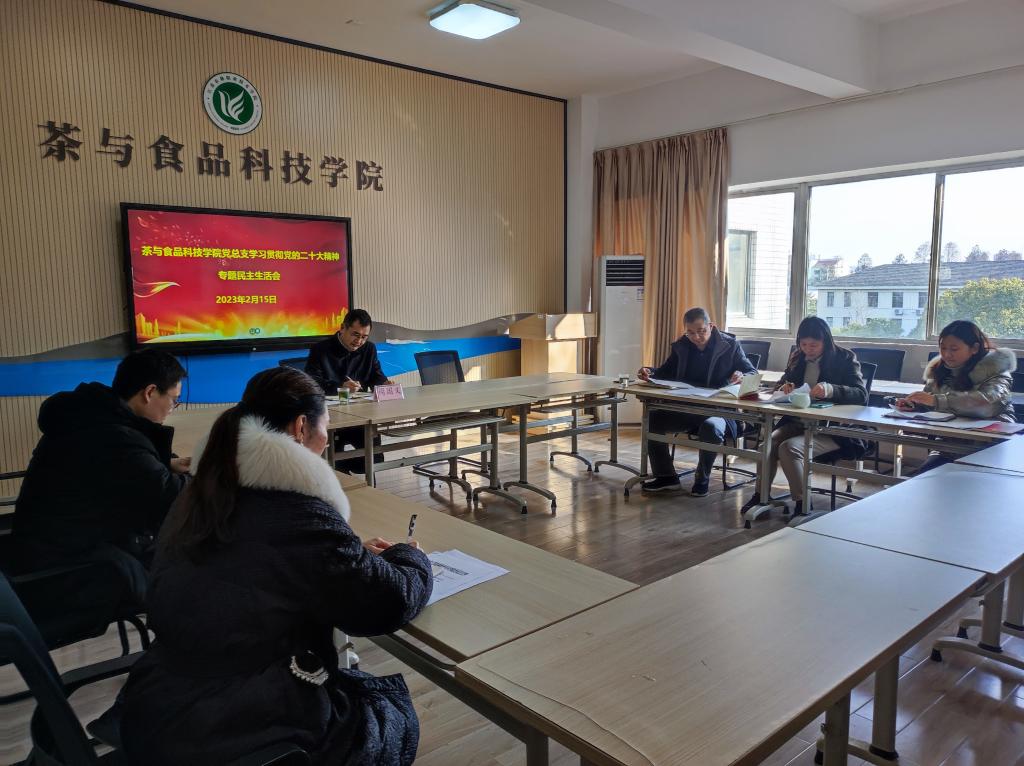 2月15日下午,根据学院《中共江苏农林职业技术学院委员会关于开好2022年度党员领导干部民主生活会的通知》(苏农林院委[2023] 2号)文件要求,茶与食品科技学院党总支在综合楼317会议室召开中层领导干部2022年度民主生活会。党总支书记谢春芹,党总支副书记、院长曹正,副书记嵇怡以及总支委员参加了会议。学院党委委员、纪委书记周国义同志出席并指导。