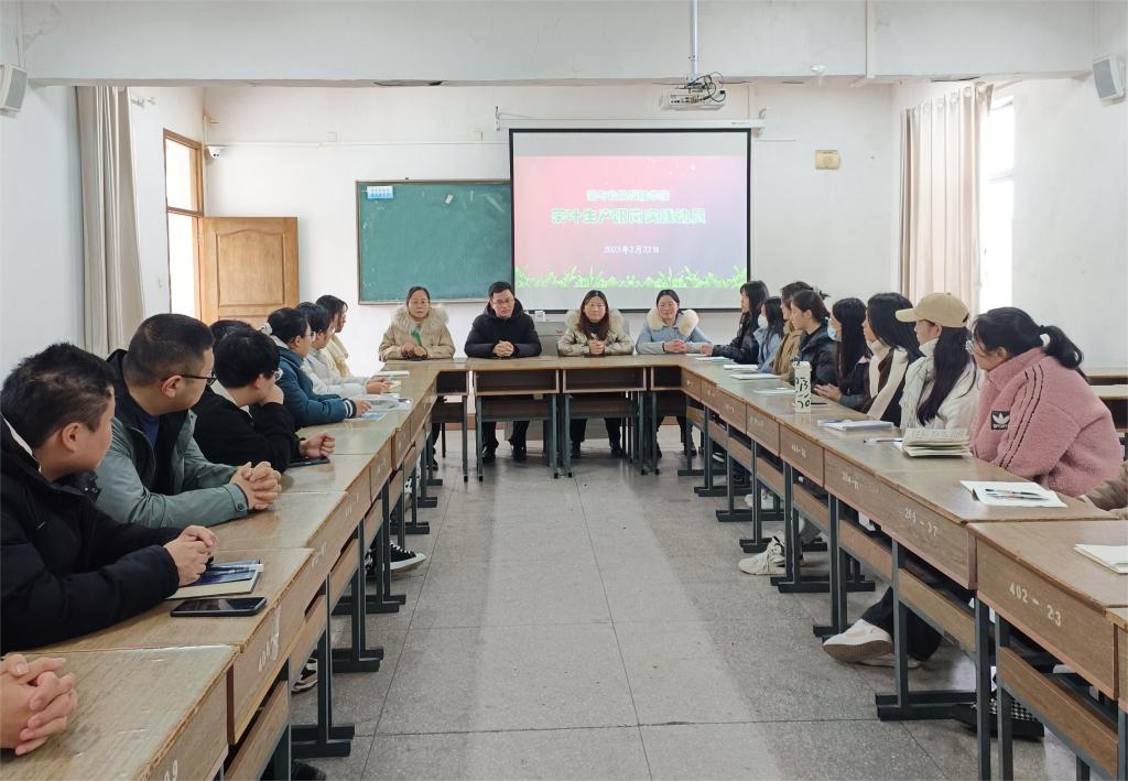 2023年2月22日下午,茶与食品科技学院21茶叶生产与加工技术班茶叶生产跟岗实践动员会在茅山校区M2-C301举行。茶与食品科技学院副院长曹淼、副书记嵇怡、茶学教研室相关教师参加了会议,会议由茶学教研室主任李园莉主持。