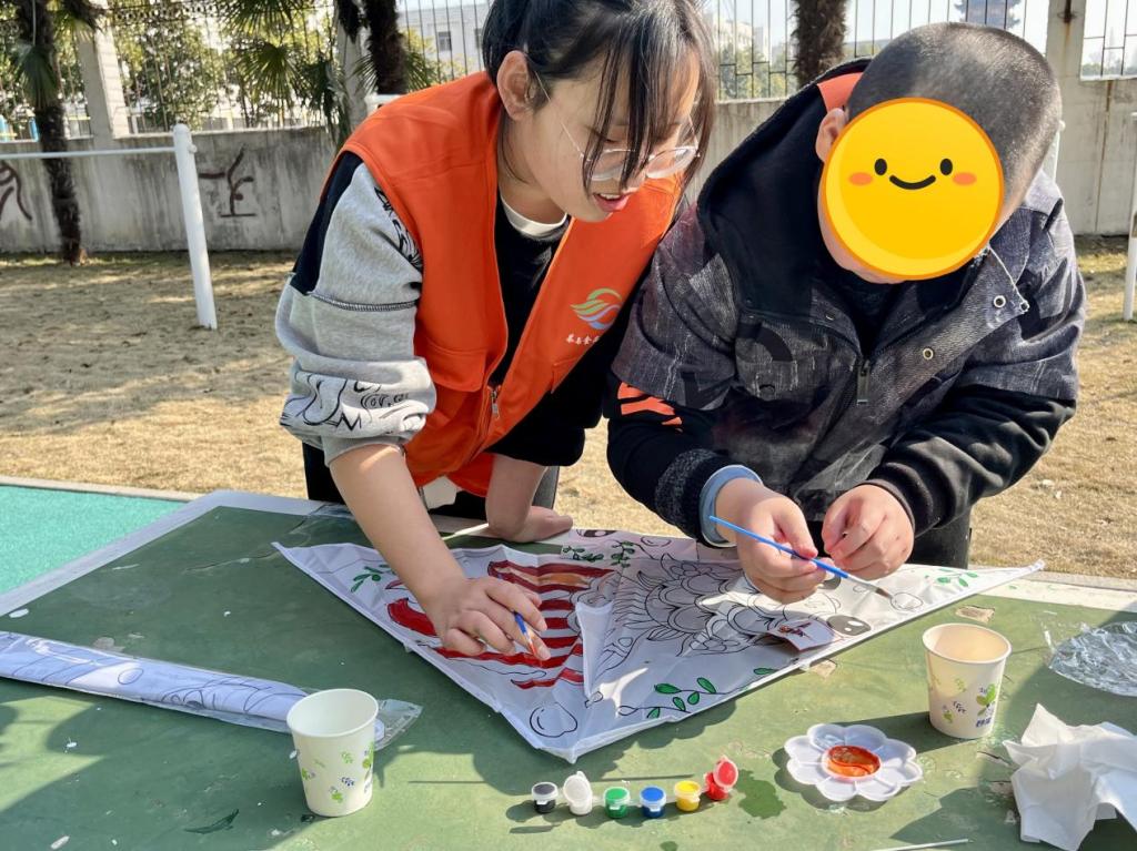 活动过程中,志愿者分别开展了剪纸、手绘风筝diy等活动,在教室里引导着小朋友们拿起剪纸,通过折叠变换、图形剪凑,形成有千纸鹤、小爱心、蜻蜓、等形态各异的窗花,在室外手绘风筝diy活动,通过色彩调配、引导示范等多种方式帮助小朋友完成布风筝绘制,小朋友们玩的不亦乐乎。