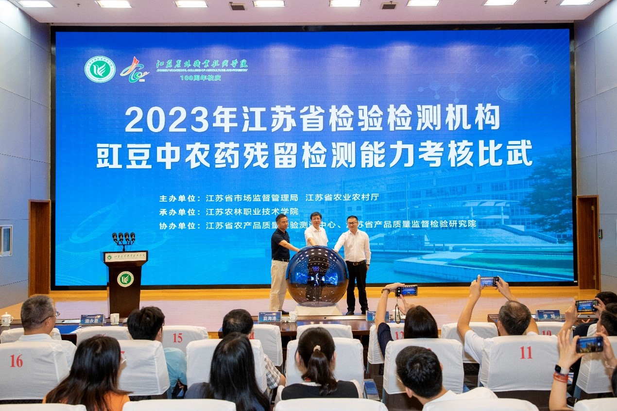 9月18日至20日,2023年江苏省检验检测机构豇豆中农药残留检测能力考核比武活动在学院举行,江苏省市场监管局副局长夏海涛,江苏省农业农村厅副厅长孙翔,江苏农林职业技术学院党委副书记、院长潘永圣,党委委员、副院长毕德全,江苏省农业农村厅农产品质量安全监管处处长李旭等领导出席开幕式。开幕式由省市场监管局认可与检验检测监督管理处处长孙蔓莉主持。