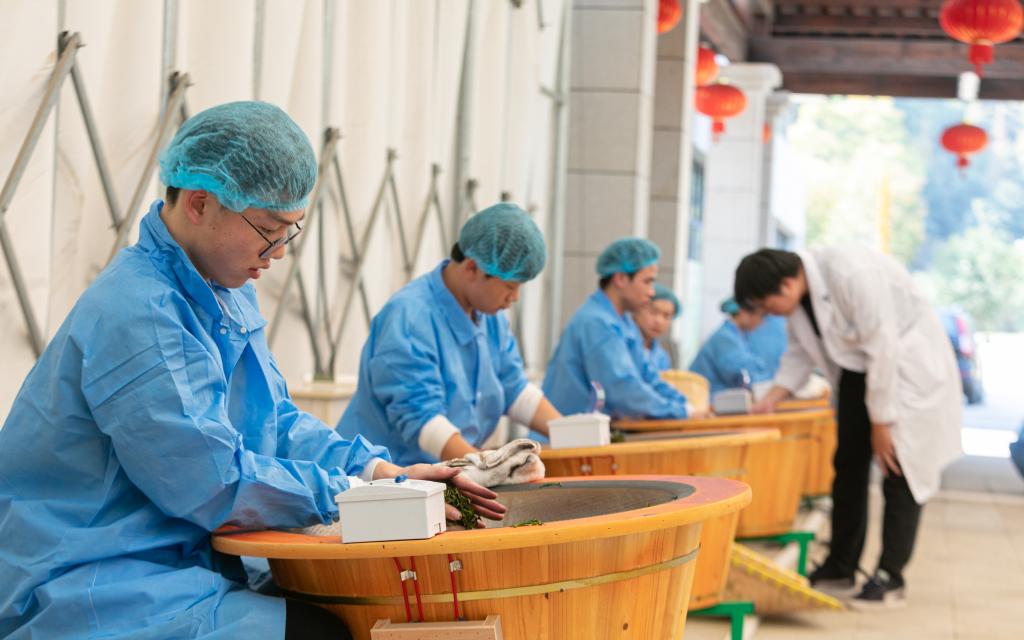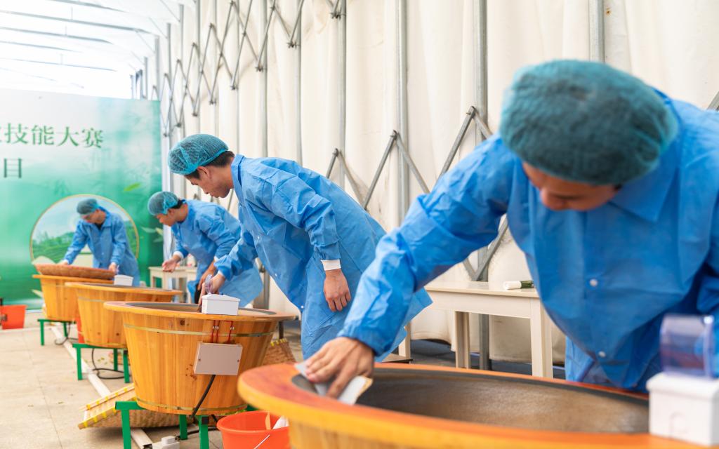 随后的手工制茶技能比赛现场,十五口炒茶锅有序排列,同学们坐在铁锅旁,活动双手,揉搓捻动,各展其能,以娴熟的制茶技巧,生动地展现了传统手工制茶的魅力。最后评委老师根据选手作品的外形、汤色、香气、滋味、叶底等内容进行综合评分,确定一、二、三等奖。