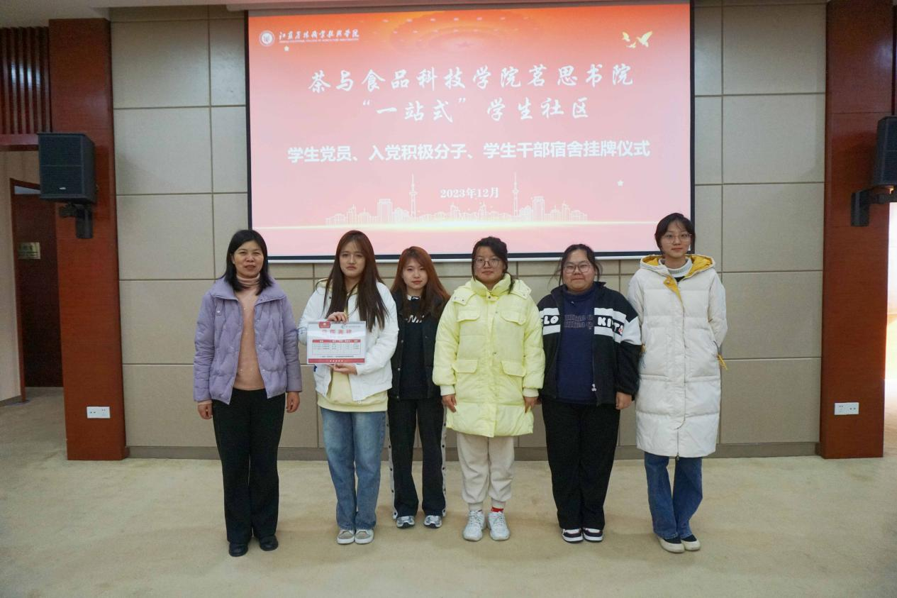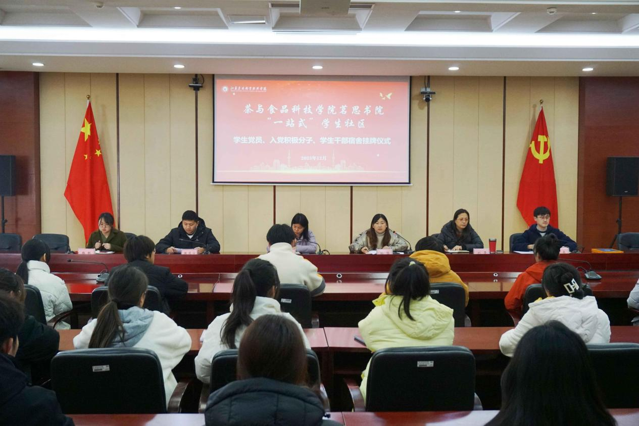 为促进学生养成良好的生活习惯,发挥学生党员在宿舍管理中的示范引领作用,共同营造健康文明、积极向上的校园宿舍文化,12月27日,茶与食品科技学院“茗思书院”学生社区在综合楼9楼会议室举行“食匠先锋亮身份 做表率”学生党员、入党积极分子、学生干部宿舍挂牌仪式,全体辅导员和部分学生代表参加了此次活动。茶与食品科技学院党总支书记谢春芹应邀出席。此次活动由学院党总支副书记嵇怡主持。