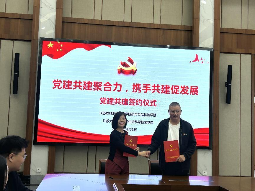 会上,生命科学技术学院党总支书记柳春华介绍了学院的情况,着重强调了两院在科研创新和学生培养方面的合作潜力,并表示期待双方在未来能够取得更多合作成果。茶与食品科技学院党总支书记曹正强调了党建共建的重要性,希望通过党建共建,能够更好地整合资源,促进学术交流,为学生提供更广阔的实践平台。会上,双方共同签署了党建共建协议,未来双方将以加强基层党组织建设为目标,强化党建业务融合,围绕教学科研、师资培养、学生管理等加强合作,推动双方各项工作的高质量发展。会议结束后,柳春华一行还参观了江苏农博园。