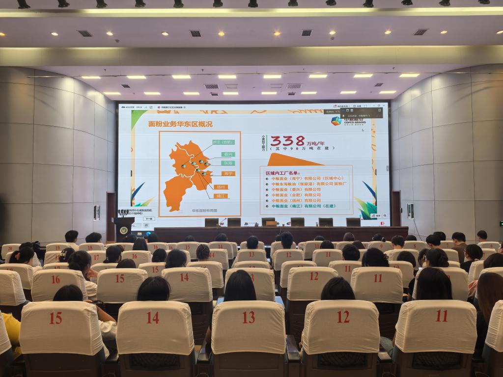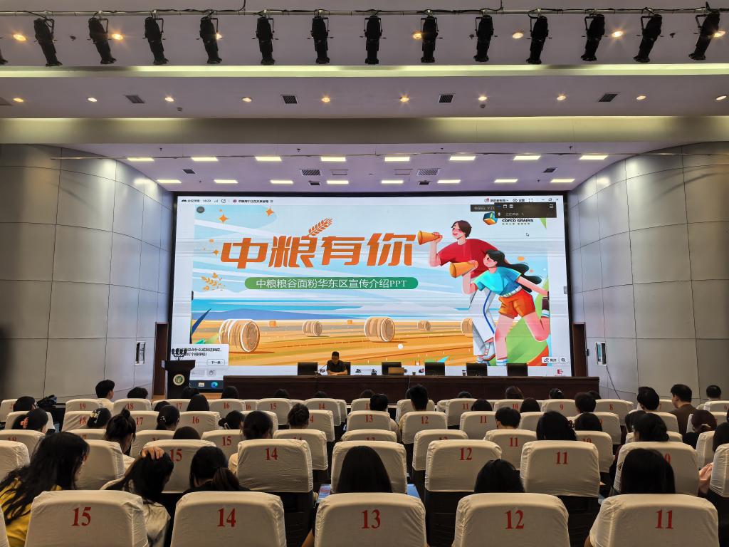 讲座中,仲鑫介绍了中粮集团在农产品加工领域的全产业链布局,结合华东地区面粉加工产业的发展趋势,阐述了中粮在技术研发、质量管控、市场布局上的领先优势,让同学们直观感受到行业龙头企业的发展潜力,介绍了公司环境、文体活动设施、食宿政策、薪资福利、人才培养与晋升通道等。优秀毕业生代表张顺彬以对话的方式分享了“从校园到职场的成长蜕变”,“从实习生到成长为企业核心技术骨干”的全过程,用“师傅带教+项目实战”的亲身经历,为学弟学妹们提供了“如何快速适应企业节奏、如何将专业知识转化为实操能力”的实用建议。
