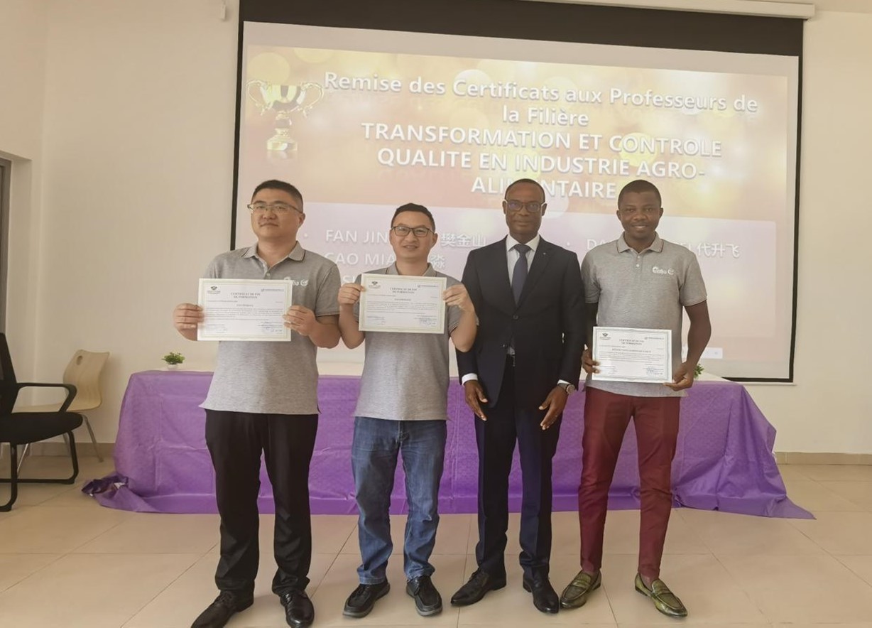 2025年7月18日至10月24日,曹淼、樊金山、李涛、代升飞四位老师先后赴科特迪瓦迪亚博校区完成了焙烤食品加工、乳制品加工、果蔬制品加工、肉制品加工、咖啡(可可)制品加工、食品理化检测技术、食品微生物检测技术等项目培训。当地时间2025年10月5日,科特迪瓦“迪亚博职业技术高中”正式成立,科特迪瓦总理罗伯特·芒贝·伯格雷、技术教育、职业培训和学徒部部长科菲·恩格桑参加了揭牌仪式。中国驻科特迪瓦使馆经商参赞李成尧、中航成套驻科特迪瓦负责人何新雨出席仪式。科菲·恩格桑部长与我院培训团队教师亲切交流,对本次培训取得的成绩表示充分肯定。他表示,当前科特迪瓦正处于经济高速发展时期,流体农产品加工行业还处于起步阶段,需要稳步发展,学院培训团队的辛勤付出,为当地学员掌握更多来自中国的新理念、新知识、新技能,贡献了巨大力量。中国驻科特迪瓦使馆经商参赞李成尧也对本次培训给予了高度评价与肯定。结业典礼上,科特迪瓦教育部办公厅主任穆斯塔法·桑加雷先生亲临现场并致辞。他对培训项目的组织实施与教学成效给予高度评价,感谢中方为科特迪瓦农产品加工人才培养所做出的努力,并希望未来继续深化合作,共同推动当地农产品加工职业教育发展。项目总协调人科菲·佛菲先生一同出席,并对参训学员顺利结业表示祝贺,对中航成套项目团队和我院教师团队表示感谢。
