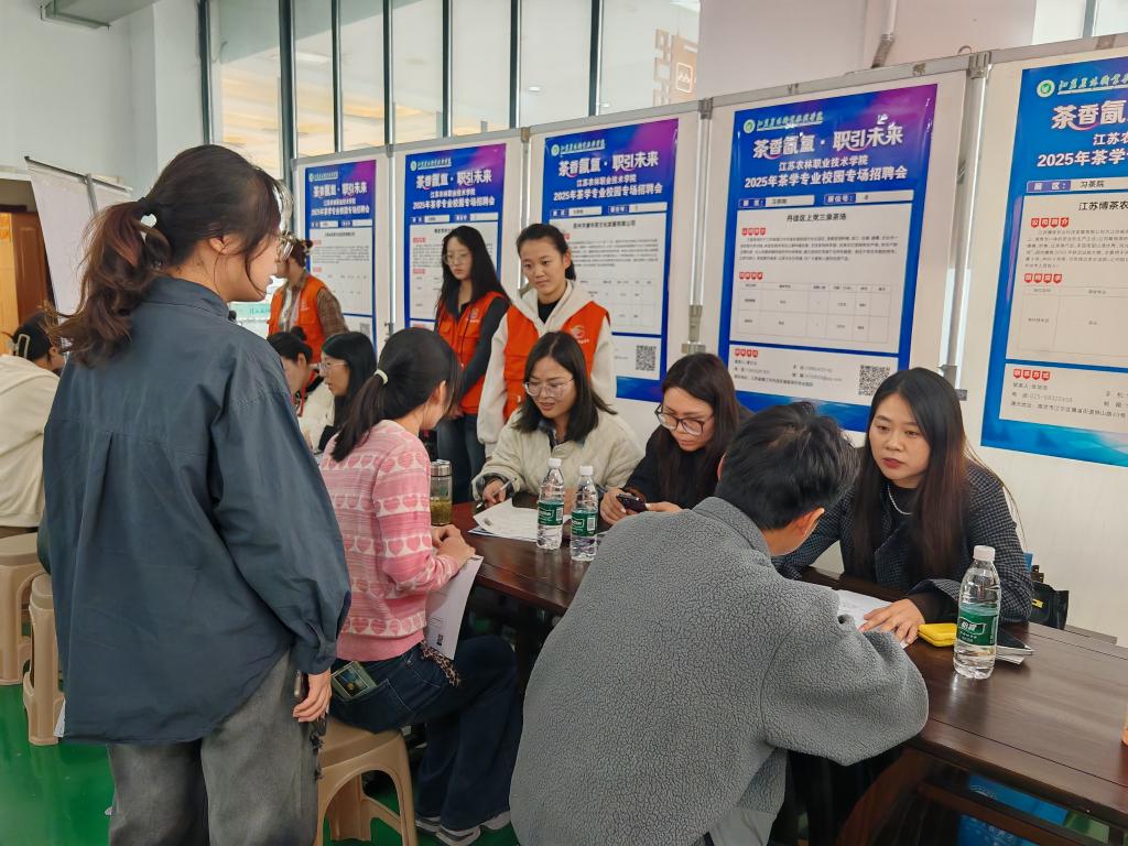 为精准对接茶产业人才需求,助力2026届毕业生高质量就业,11月5日,茶与食品科技学院联合江苏省茶叶学会,在江苏茶博园习茶院举办“茶香氤氲·职引未来”2025年茶学专业校园专场招聘会。江苏省茶叶学会理事长巫建华、常务副理事长王润贤教授、江苏农林职业技术学院党委副书记曹仁勇、茶与食品科技学院院长谢春芹等出席活动。